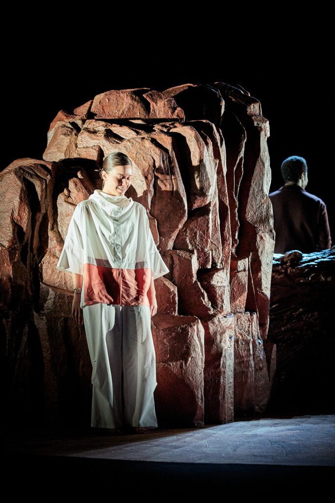 С развитието на разговорите между двата персонажа, откриваме, че дъщерята е взела решение да се подложи на лечение, което ще изтрие всичките й спомени, за да може да стане част от създаването на нова утопия на Марс. Нейната памет постепенно започва да изчезва, а миговете, които имат заедно става все по-малко. Изтичащото време помежду им е изобразено чрез въртящия се сценичен кръг. От момента, че които ние разбираме тази информация той се задвижва плавно. Заедно с него навлиза нежно осветление на топли тонове. Постепенно кръгът засилва своето въртене, а цветовете се променят към сюрреалистични виолетови проблясъци, влитащи спомен и сън. Реалността започва да се изплъзва. Актьорите изведнъж се озовават върху циферблат на часовник, изобразявайки двете стрелки сочещи в различни посоки. Бързината на въртежа разпуква земята, като пукнатина в стъкло, през което изтича времето в разстоянието между двамата.